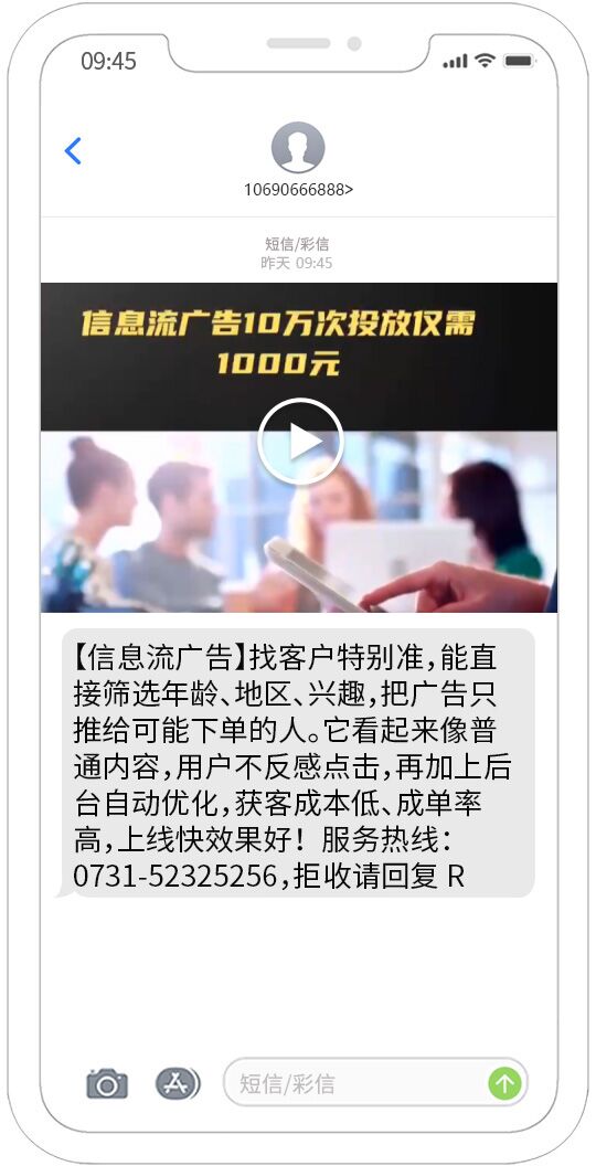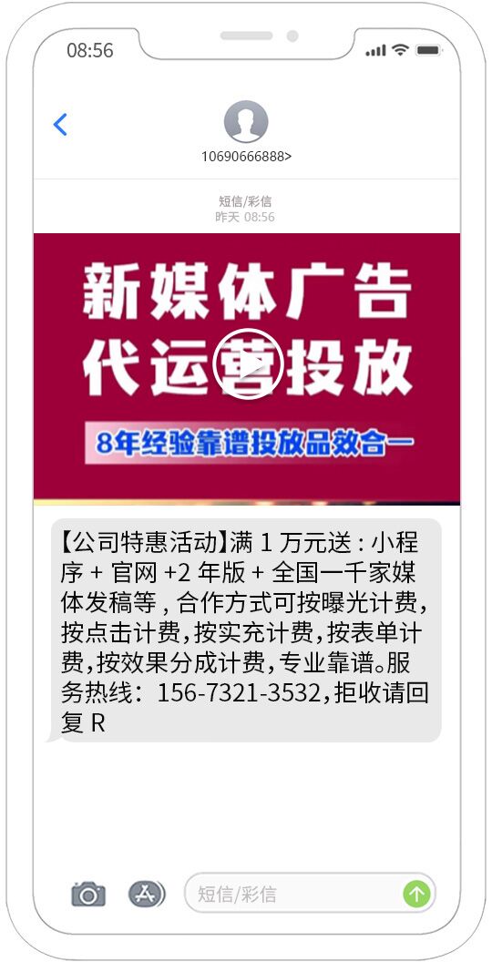 視頻短信發送能夠覆蓋移動、聯通、電信用戶,正規集團視頻短信通道,快速、可靠、穩定、形象好,能快速將您的訊息投放到用戶的手機。